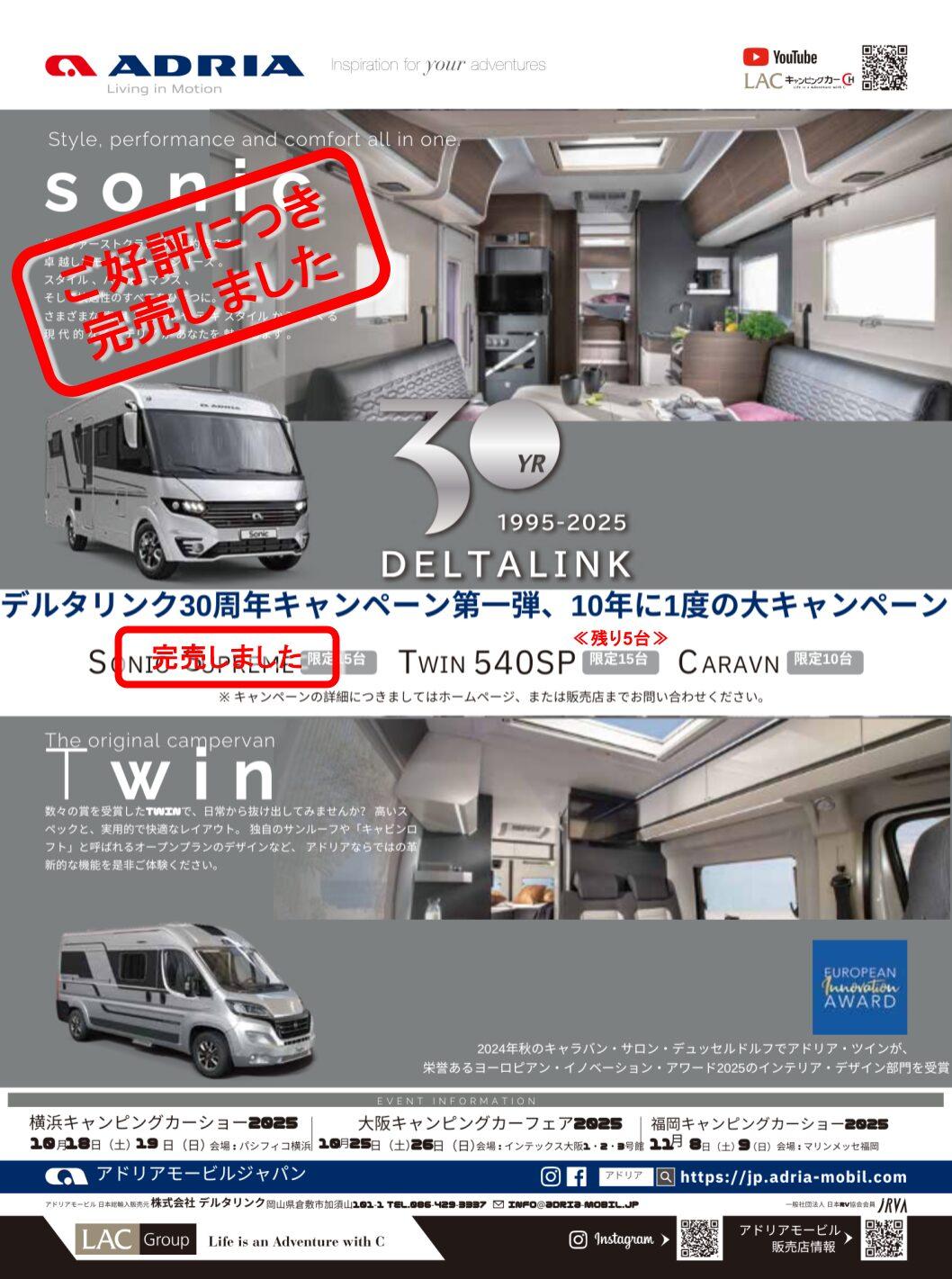 デルタリンクが創立して30年が経ちました♪ 30年という節目の年に、皆さんへの感謝を込めて【30周年 特別キャンペーン】を開催いたします! ADRIAのモーターホーム、キャラバンに付けるOPをお得な価格でご用意しています!! お得なOPはこちら ⇊ 是非この機会にご検討してみてはいかがでしょうか? 一覧に戻る