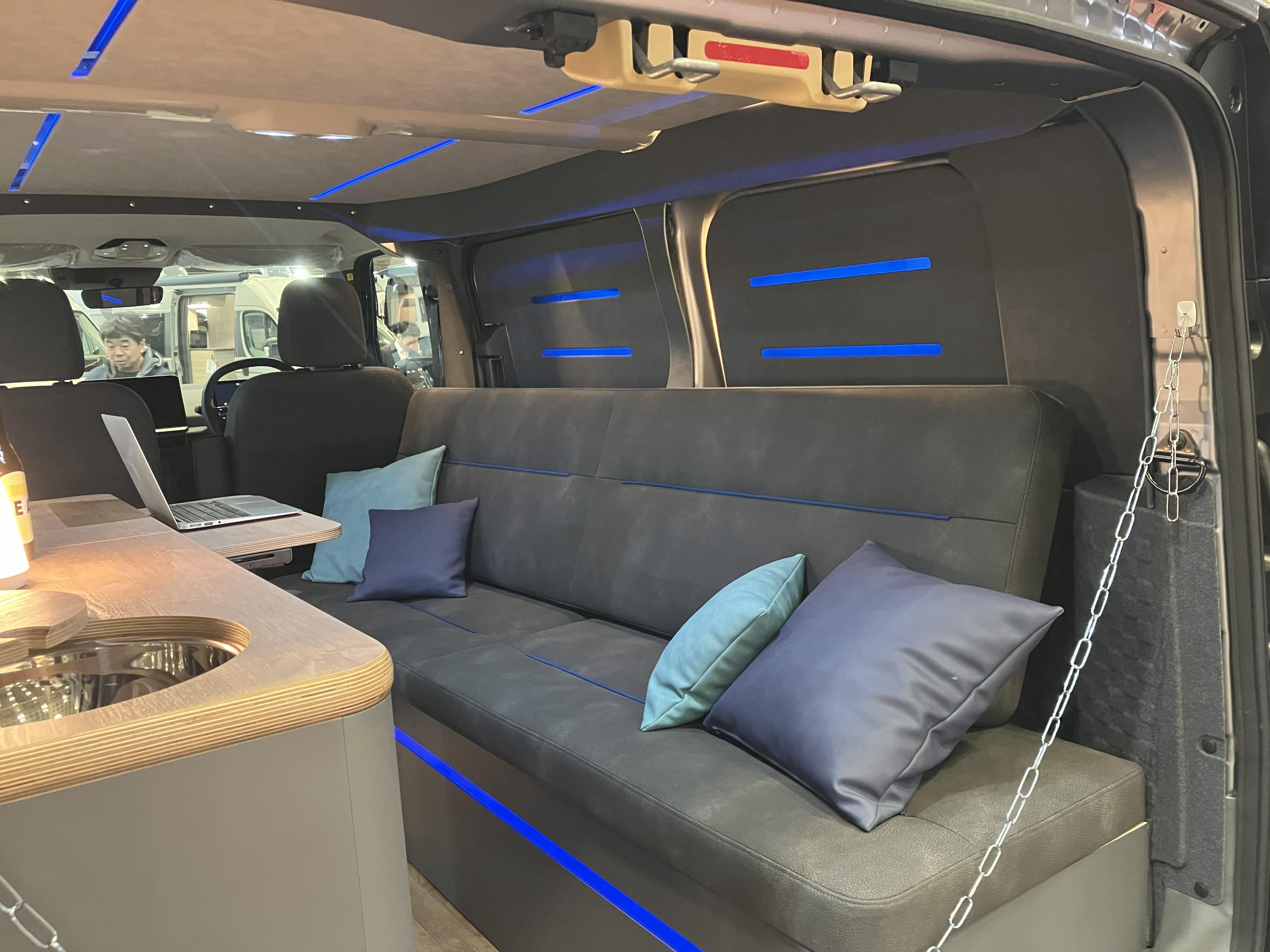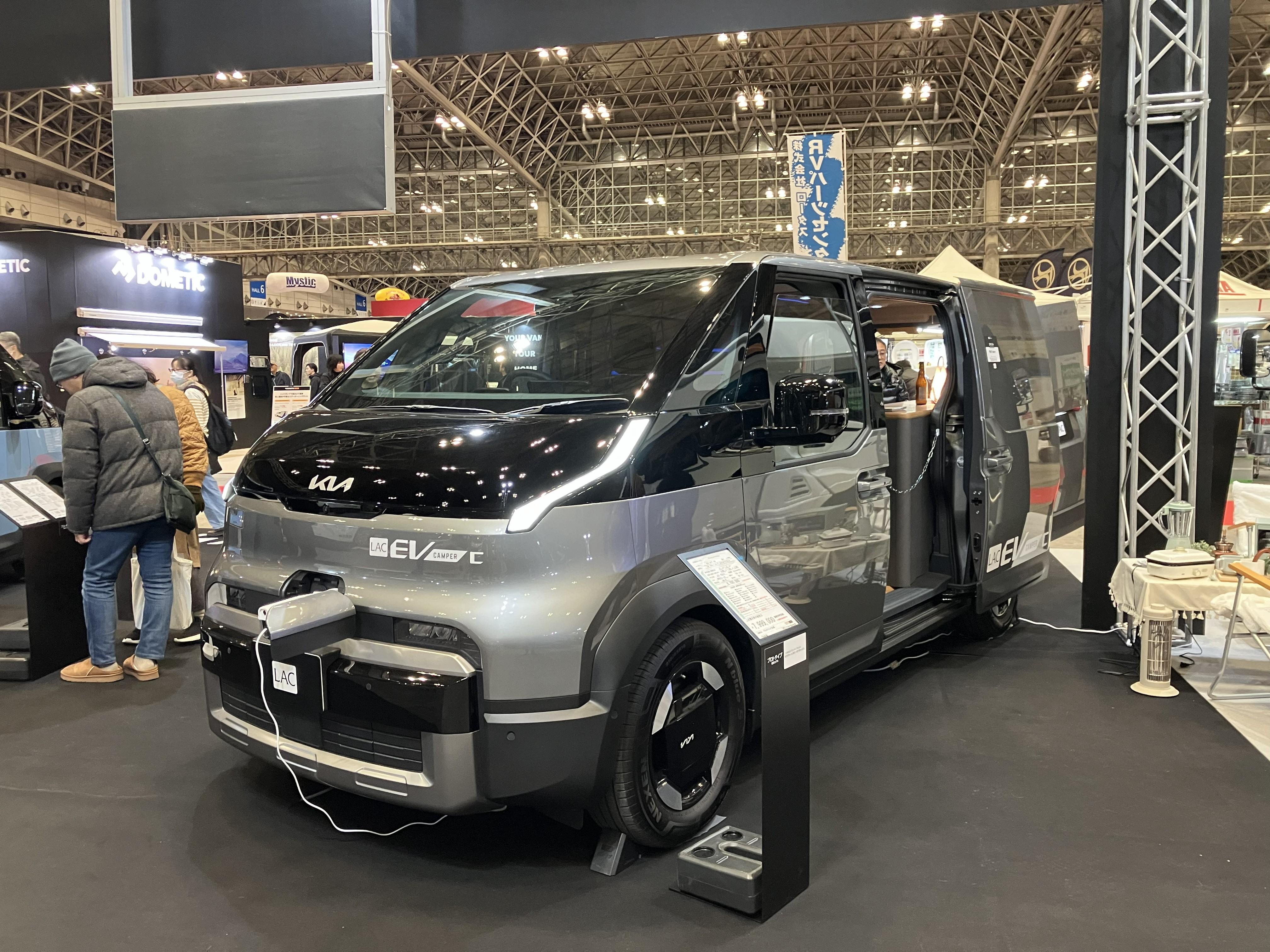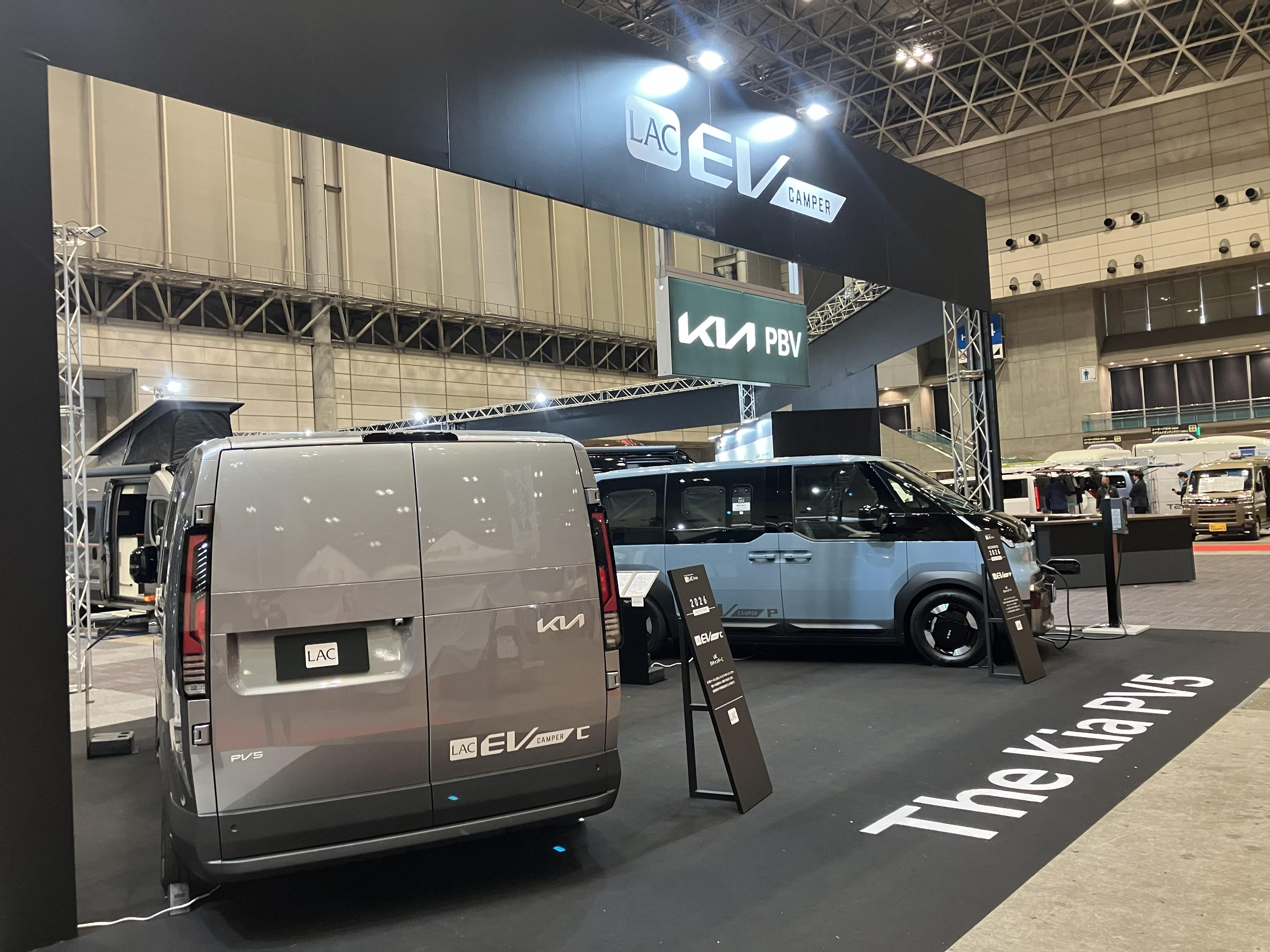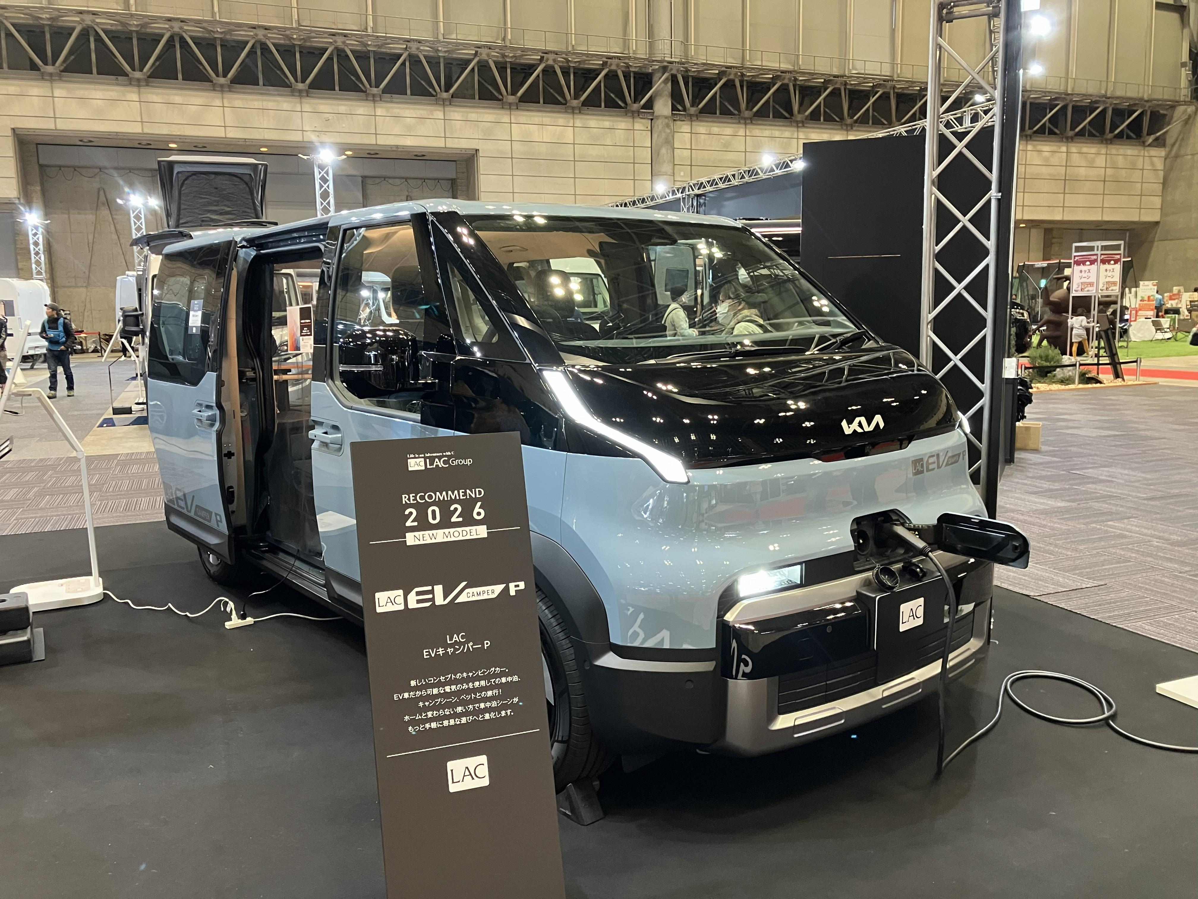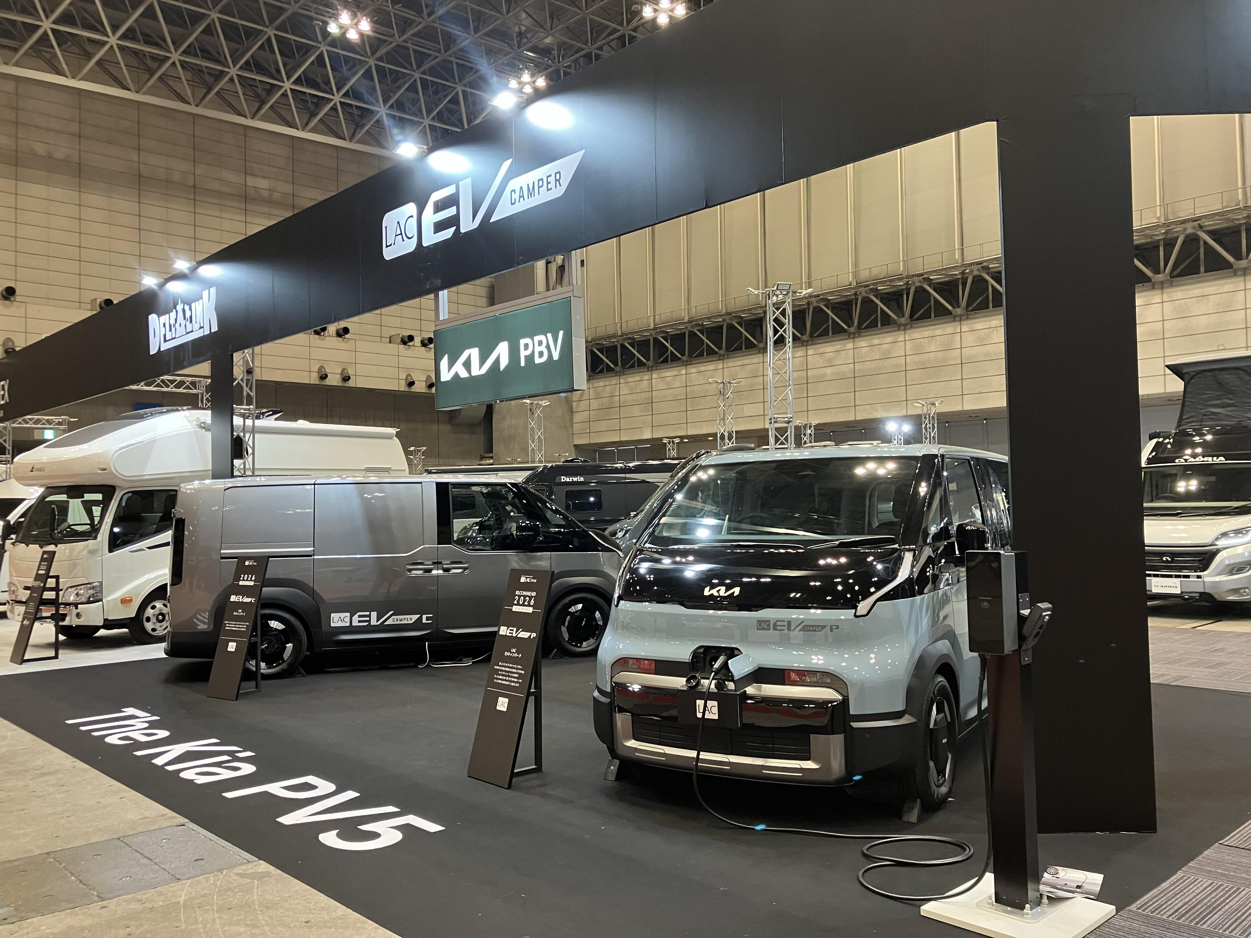 今回の目玉です!KIAからEV自動車「PV5」のキャンピングカー製作し出展致しました!日本初のKIA PV5のキャンピングカーとなります!!ワゴンタイプのパッセンジャー(右)バンタイプのカーゴ(左)でございます。あくまでも参考出展ではございますが今年から発売されるKIA PV5は見逃せませんよ!EV自動車の画期的な利用方法はキャンピングカーにあり!!!!