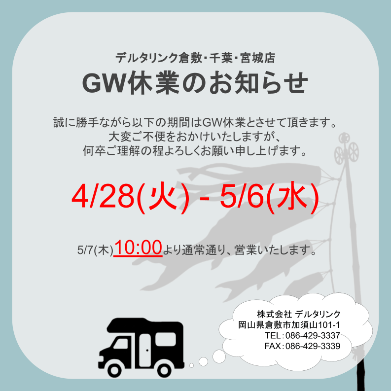 平素は格別ご高配賜り、厚く御礼申し上げます。 さて、誠に勝手ながらデルタリンク倉敷・千葉・宮城店では、以下の日程でゴールデンウィーク休業とさせていただきます。 皆様には大変ご不便をおかけいたしますが、何卒ご理解のほどお願い申し上げます。 【GW休業期間】 2026年4月28日(火)~5月6日(水) 5月7日(木)10:00より通常通り、営業いたします。 一覧に戻る